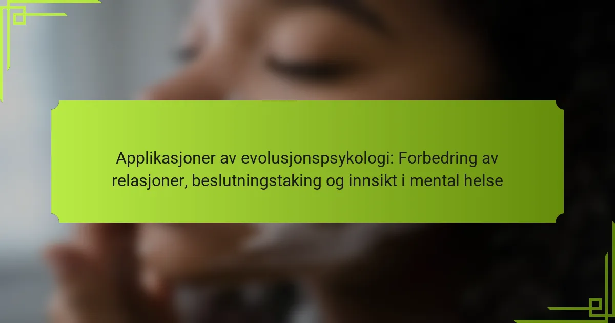 Evolusjonspsykologi kan forbedre praksis innen mental helse ved å gi innsikt i menneskelig atferd og emosjonelle responser. Den hjelper praktikere med å forstå opprinnelsen til psykologiske problemer, noe som fører til mer effektive intervensjoner. For eksempel kan anerkjennelse av at angst kan stamme fra evolusjonære overlevelsesmekanismer gjøre det mulig for terapeuter å tilpasse mestringsstrategier. I tillegg kan evolusjonære perspektiver på relasjonsdynamikk informere terapi, og fremme sunnere interaksjoner. Denne tilnærmingen oppmuntrer til en helhetlig forståelse av mental helse, som integrerer biologiske, psykologiske og sosiale faktorer.
