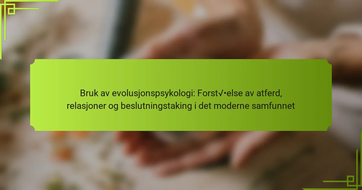 Evolusjonspsykologi undersøker universelle egenskaper som former menneskelig atferd, relasjoner og beslutningstaking. Disse egenskapene inkluderer adaptive atferder, kriterier for valg av partnere, mekanismer for sosial bonding og kognitive skjevheter. Adaptive atferder, som samarbeid og konkurranse, forbedrer overlevelse og reproduksjonssuksess. Kriterier for valg av partnere prioriterer ofte trekk knyttet til genetisk egnethet. Mekanismer for sosial bonding, som tilknytningsstiler, letter gruppekoherens. Kognitive skjevheter, inkludert bekreftelsesskjevhet, påvirker beslutningstakingprosesser. Hver egenskap reflekterer underliggende evolusjonære press, og gir innsikt i moderne menneskelige interaksjoner.