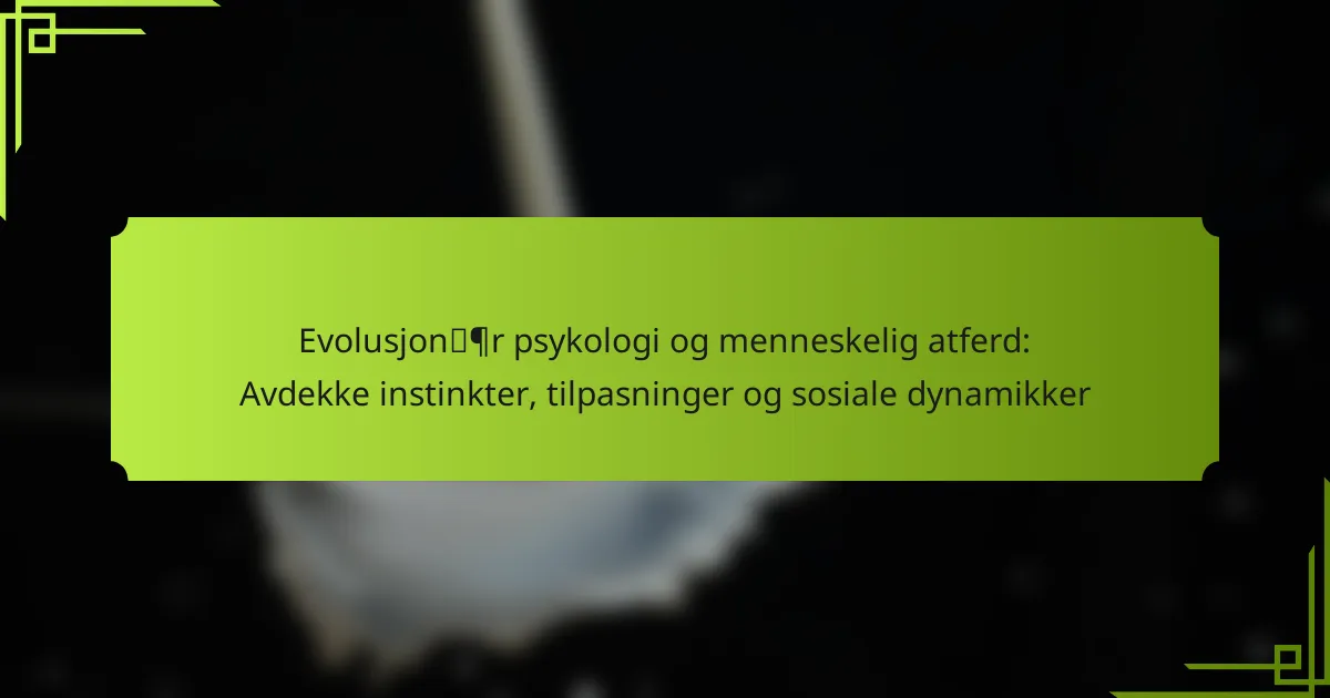 Evolusjonspsykologi er basert på premissen om at menneskelig atferd formes av evolusjonære prosesser. Den undersøker hvordan instinkter og tilpasninger påvirker sosiale dynamikker og beslutningstaking. Nøkkelaspekter inkluderer naturlig seleksjon, som favoriserer trekk som forbedrer overlevelse og reproduksjon, og rollen til forfedres miljøer i å forme moderne atferd. Dette feltet integrerer innsikter fra biologi, antropologi og psykologi for å forklare komplekse menneskelige interaksjoner og motivasjoner.
